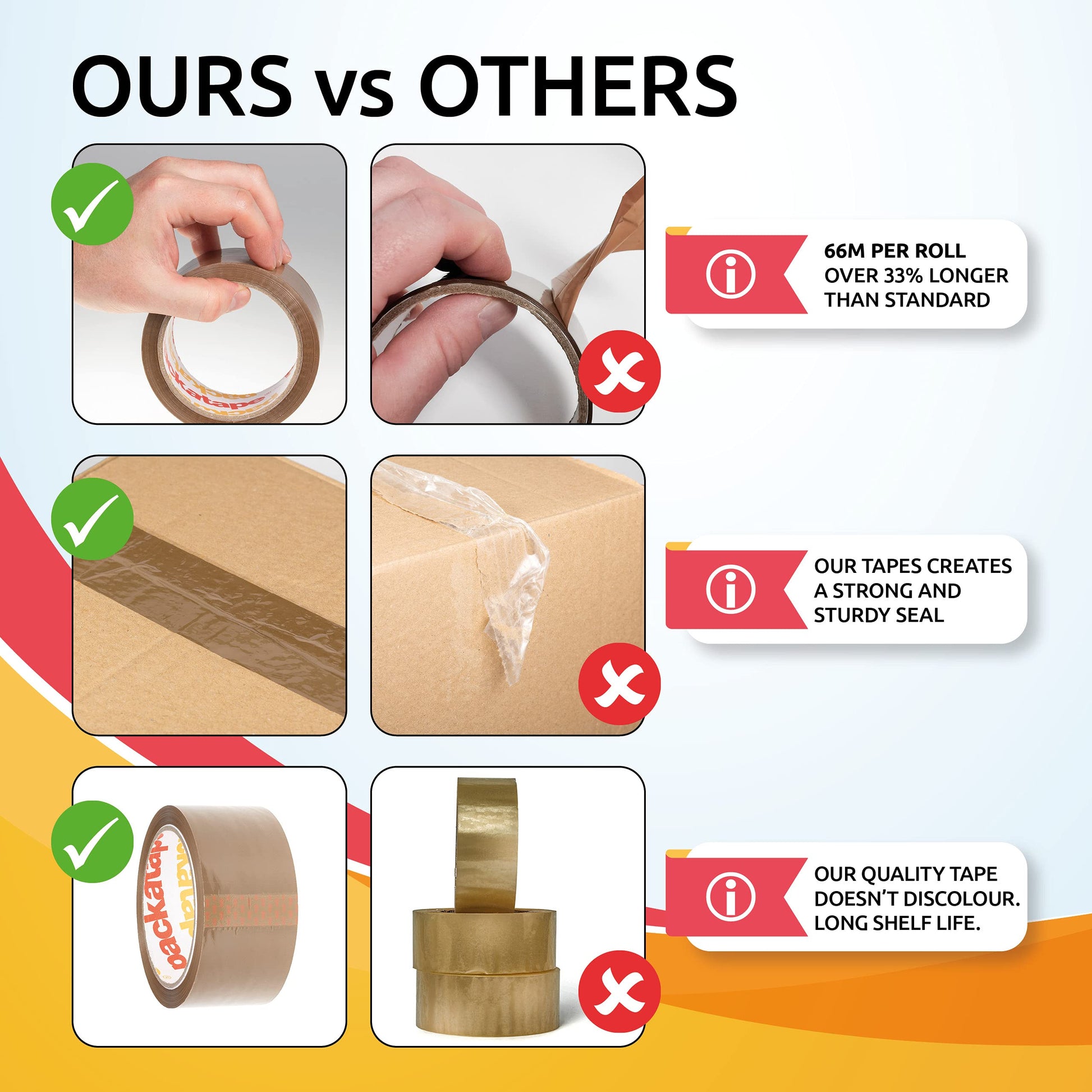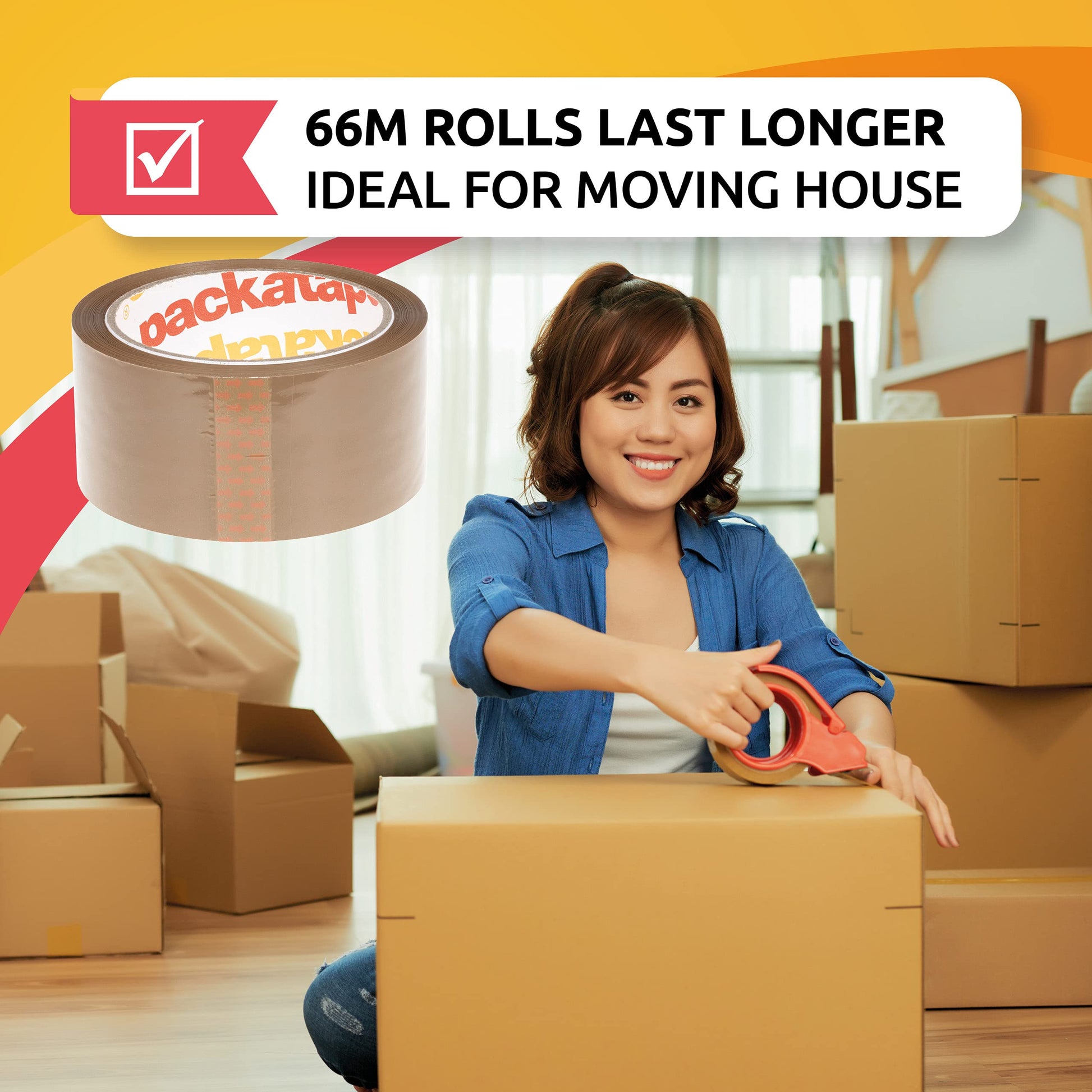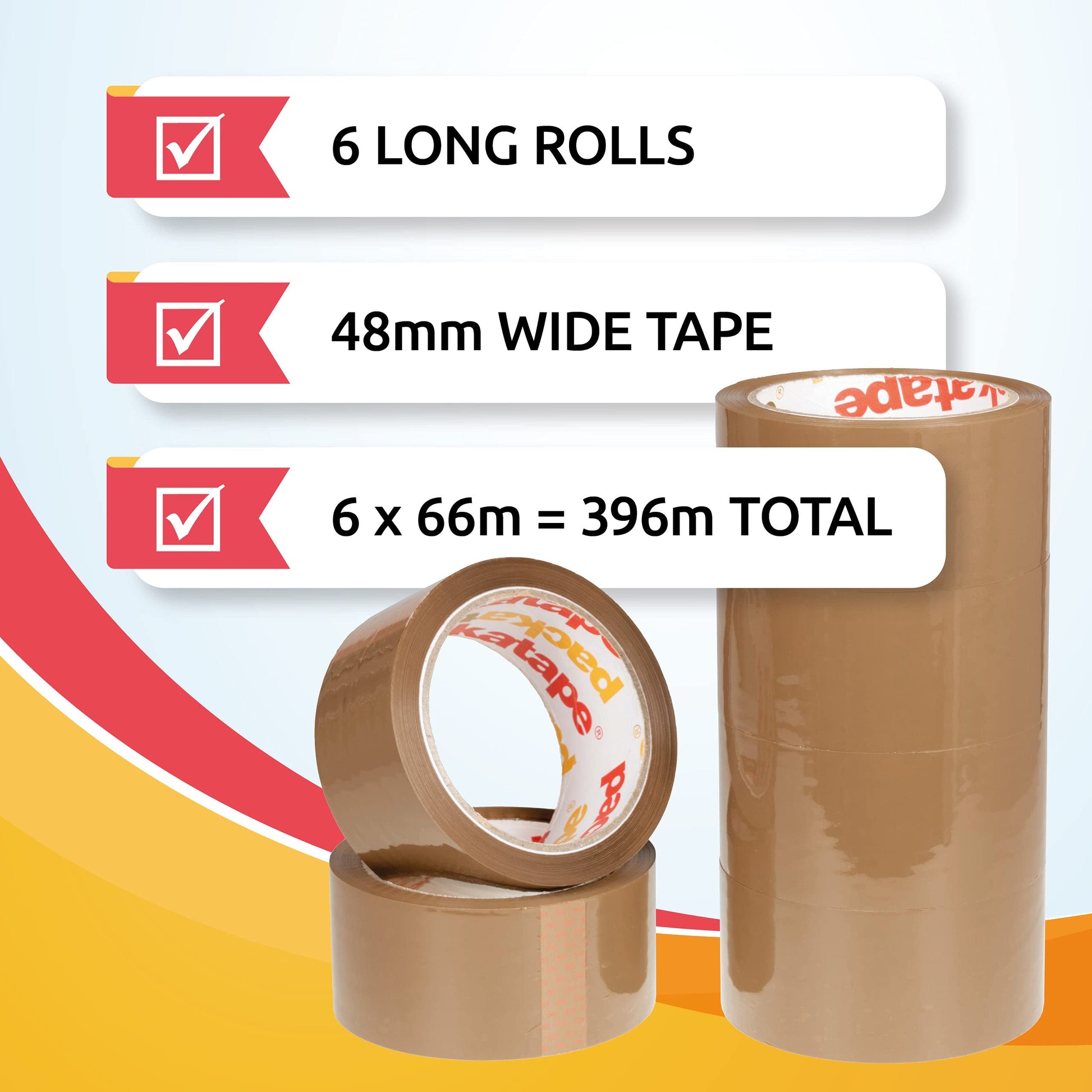 - 💷 SAVE BIG - Huge value! 6 extra long rolls of 48mm x 66m tape for packing boxes. Super sticky and strong 💪🏼 Spare yourself the premium of overpriced brand names 😉