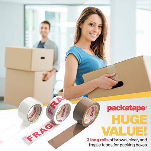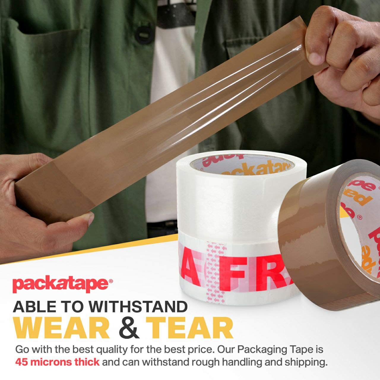 - Save big - Huge value! 3 extra long rolls of 48mm x 66m tape (1 roll x brown, 1 roll x clear and 1 roll fragile tape) for packing boxes. Super sticky and strong. Spare yourself the premium of overpriced brand names.